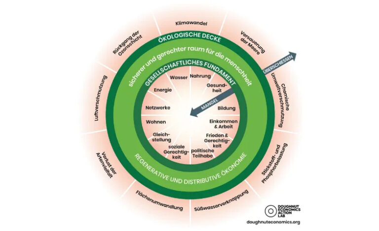 Die Doughnut-Ökonomie, entwickelt von der bekannten Ökonomin Kate Raworth, unterstützt Städte, Gemeinden und Firmen, eine zukunftsfähige Gesellschaft zu organisieren. Der Doughnut vereint Konzepte wie die UN-Nachhaltigkeitsziele und das Modell der planetaren Grenzen in ein ganzheitliches Modell.